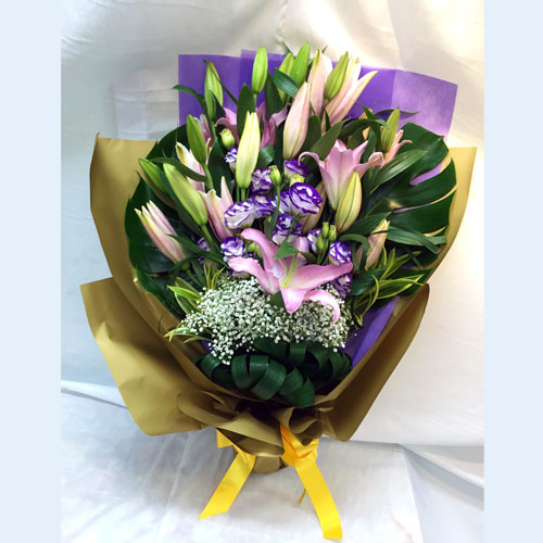 This bouquet features stunning pink lilies arranged with eustomas and baby’s breath.