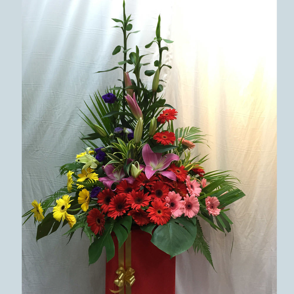Floral arrangement features colourful gerberas, lilies and esutoma flowers.
